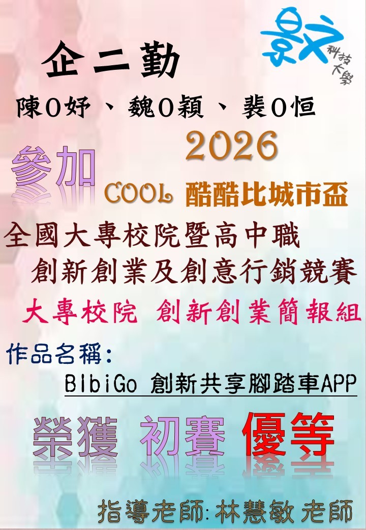 恭喜~林O敏老師指導企管二勤陳O妤、魏O穎、裴O恒同學參加「2026酷酷比全國大專校院暨高中職創新創業及創意行銷競賽」榮獲大專校院「創新創業簡報組」【優等】 (115.04.16)