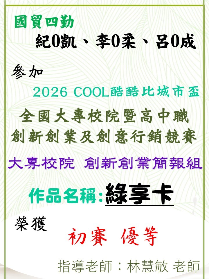 恭喜~林O敏老師指導國貿四勤紀O凱、李O柔、呂O成同學參加「2026酷酷比全國大專校院暨高中職創新創業及創意行銷競賽」榮獲大專校院「創新創業簡報組」【優等】 (115.04.16)