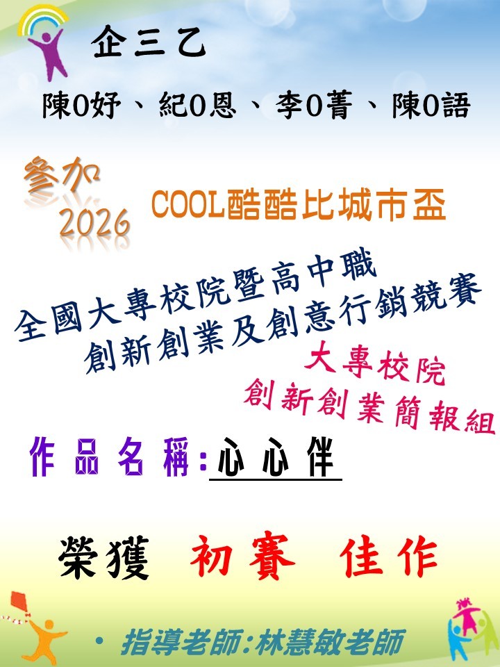 恭喜~林O敏老師指導企管三乙陳O妤、紀O恩、李O菁、陳O語同學參加「2026酷酷比全國大專校院暨高中職創新創業及創意行銷競賽」榮獲大專校院「創新創業簡報組」【佳作】 (115.04.16)