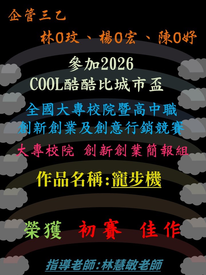 恭喜~林O敏老師指導企管三乙林O玟、楊O宏、陳O妤同學參加「2026酷酷比全國大專校院暨高中職創新創業及創意行銷競賽」榮獲大專校院「創新創業簡報組」【佳作】 (115.04.16)