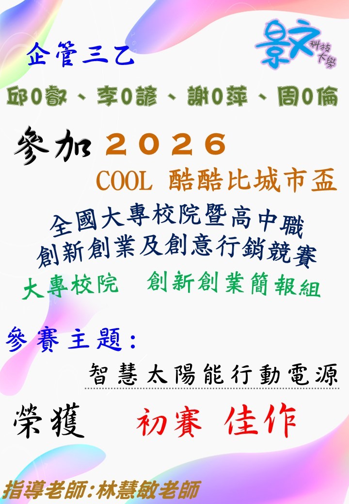 恭喜~林O敏老師指導企管三乙邱O叡、李O諺、謝O萍、周O倫同學參加「2026酷酷比全國大專校院暨高中職創新創業及創意行銷競賽」榮獲大專校院「創新創業簡報組」【佳作】 (115.04.16)