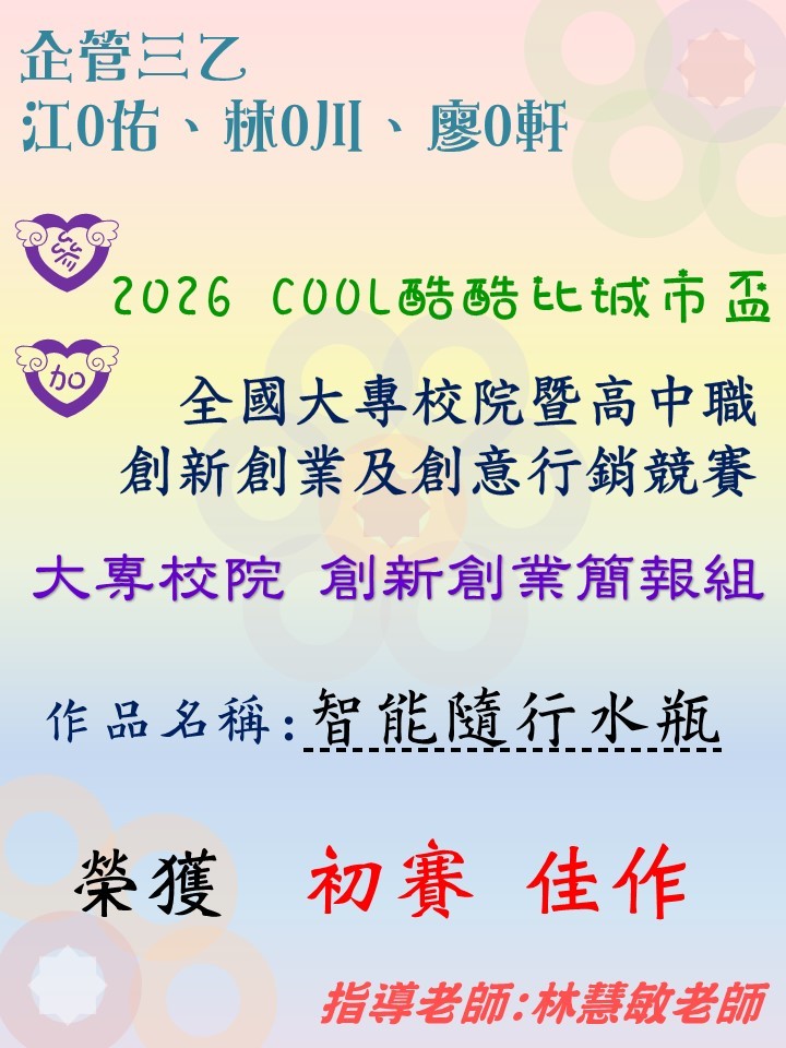 恭喜~林O敏老師指導企管三乙江O佑、林O川、廖O軒同學參加「2026酷酷比全國大專校院暨高中職創新創業及創意行銷競賽」榮獲大專校院「創新創業簡報組」【佳作】 (115.04.16)
